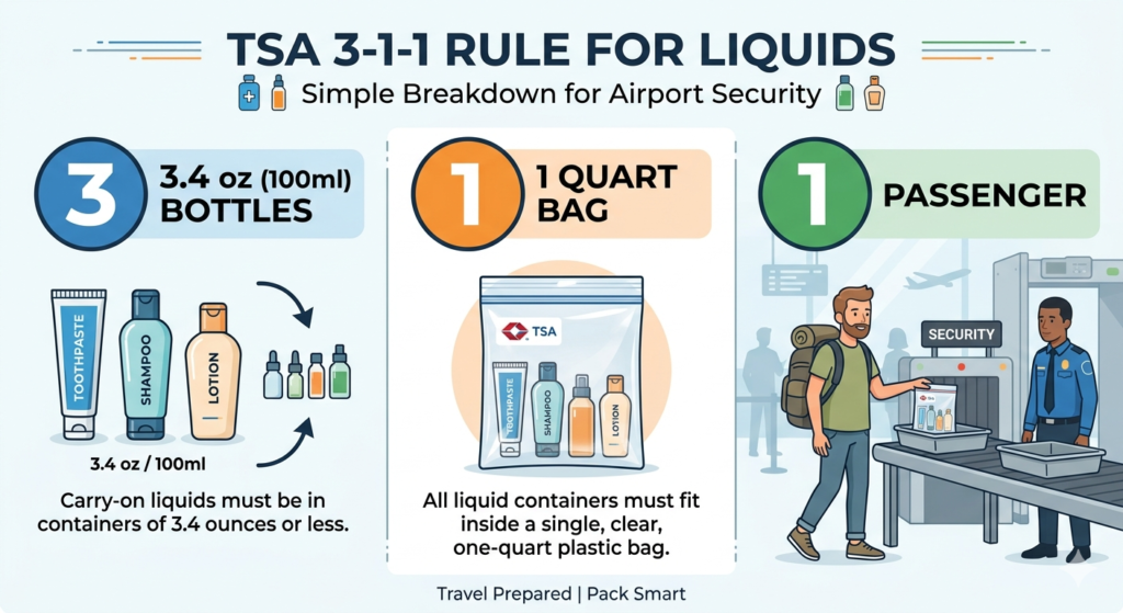 This guide to TSA liquid rules centers on the foundational 3-1-1 rule. It states that all liquids, aerosols, gels, creams, and pastes must be in containers of 3.4 ounces (100 milliliters) or less, and all containers must fit inside one single quart-sized clear plastic bag per passenger.