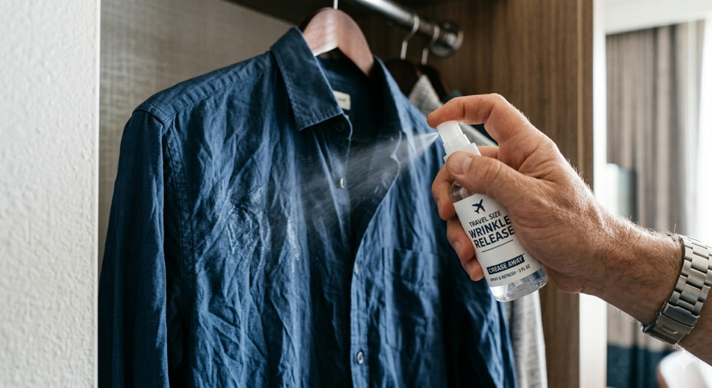 Packing a small bottle of travel wrinkle release spray provides instant results. These solutions are specifically formulated to relax fabric fibers on contact. You simply mist the garment lightly, snap the fabric downward a few times, and smooth the surface with your hands.
