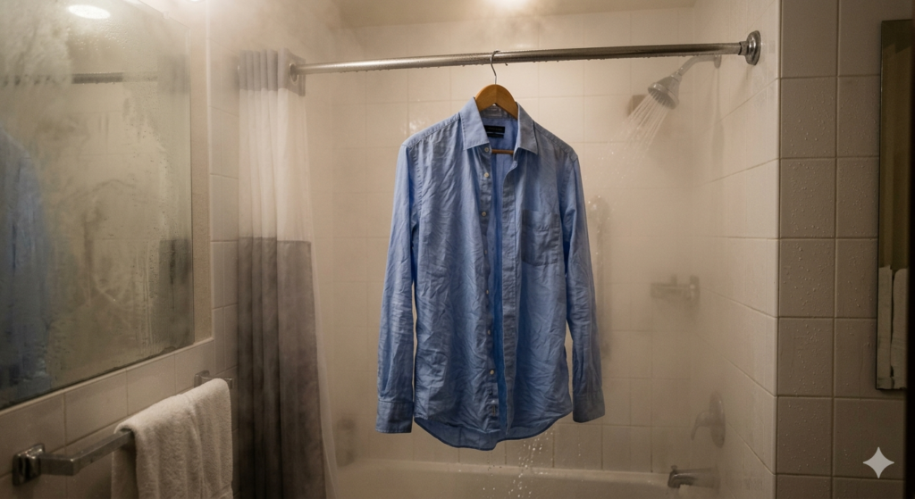 The oldest and most reliable traveler’s secret is the shower steam trick. This method requires zero extra gear and utilizes the resources you already have in any standard hotel room. It is perfect for refreshing a complete outfit while you get ready for the day.