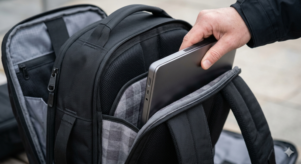 Your laptop, heavy electronics organizers, books, and dense toiletry bags belong in this zone. Many modern travel bags feature a dedicated laptop sleeve positioned directly against the back panel for this exact reason.