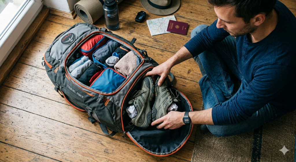Always pack your shoes at the very bottom of the main compartment, closest to your lower back. This creates a solid, heavy foundation that stabilizes the bag when it sits on the floor and keeps your center of gravity low while walking. For a comprehensive masterclass on how to build the perfect foundation for your luggage, review our complete guide on How to Pack a Backpack for Travel.