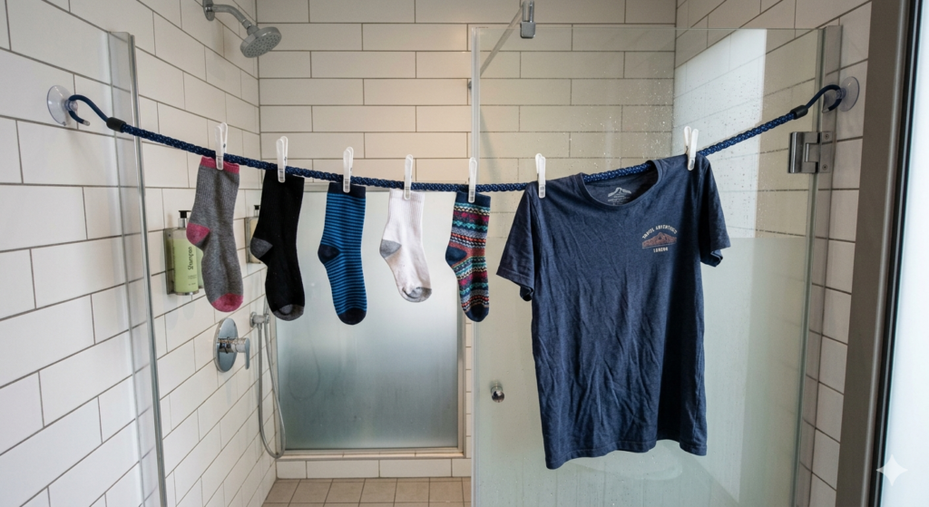 When setting up your clothesline for travel, look for anchor points that offer high ventilation. Stringing the line near an open window, across a bathroom with an exhaust fan, or directly under an air conditioning vent will dramatically reduce drying times.