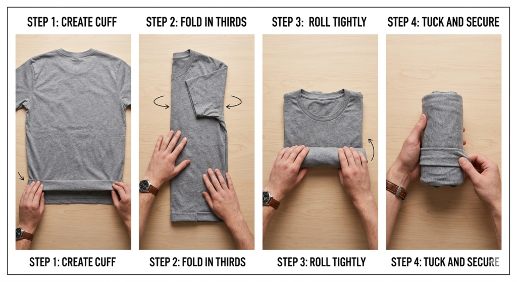 Learning this technique requires a bit of practice, but the process becomes second nature very quickly. When first learning, utilizing a flexible, forgiving garment like a lightweight travel t-shirt makes the folding process much smoother. Start by finding a flat, clean surface like a bed or a table.