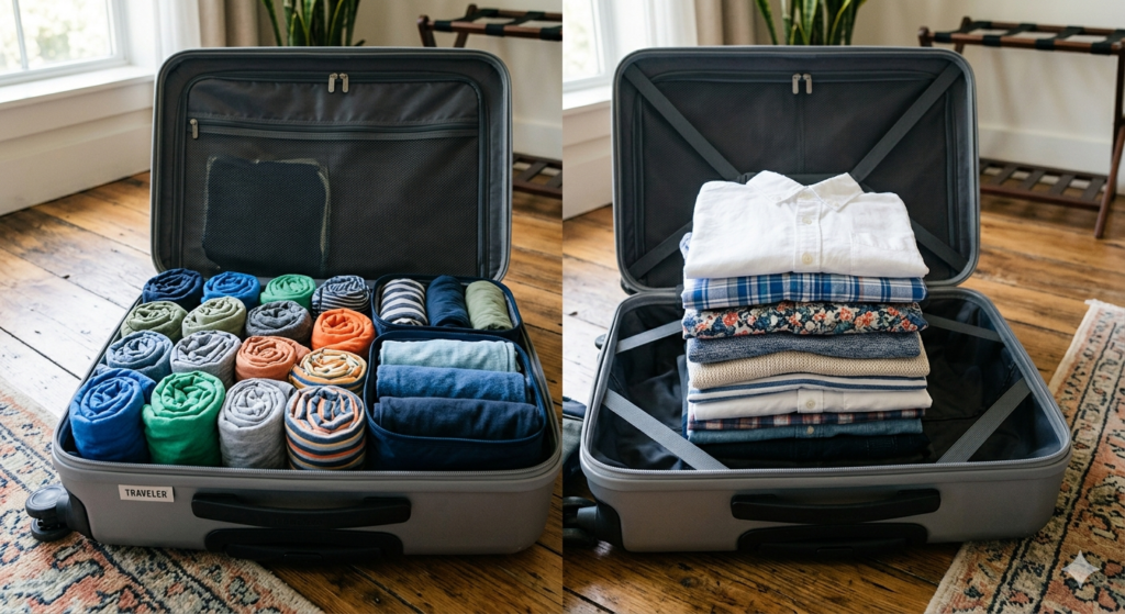 Why roll clothes instead of fold? Rolling clothes compresses fabric into tight cylinders, squeezing out trapped air to maximize luggage space. This method prevents hard creases from forming during transit, making it the superior choice for minimalist packing and keeping your travel wardrobe organized.